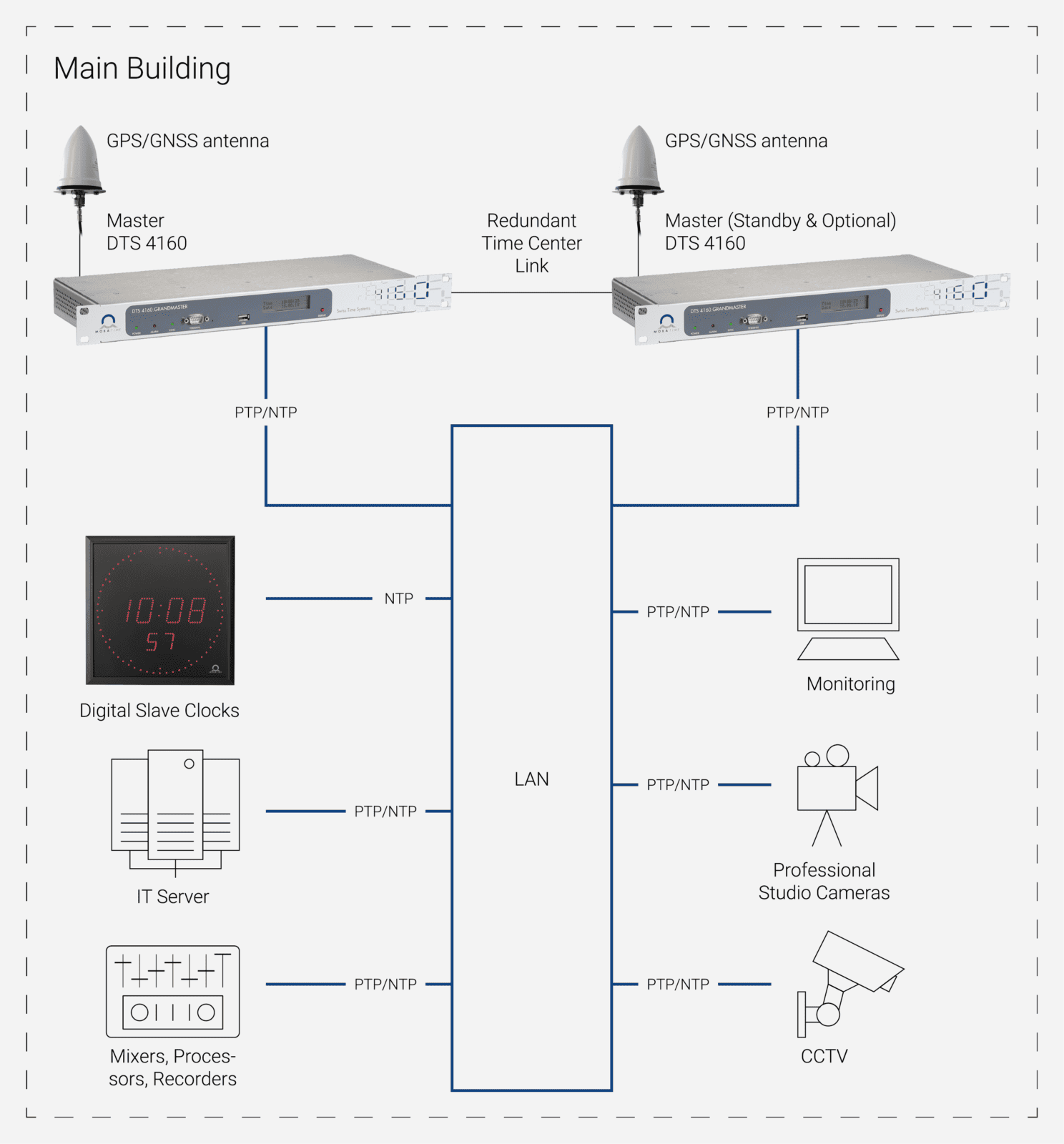 Grâce à nos serveurs de temps / horloges maîtresses, vous pouvez synchroniser toutes les horloges ainsi que votre réseau dans l'ensemble de l'infrastructure. Pour obtenir une haute disponibilité, un système de temps redondant peut être envisagé.