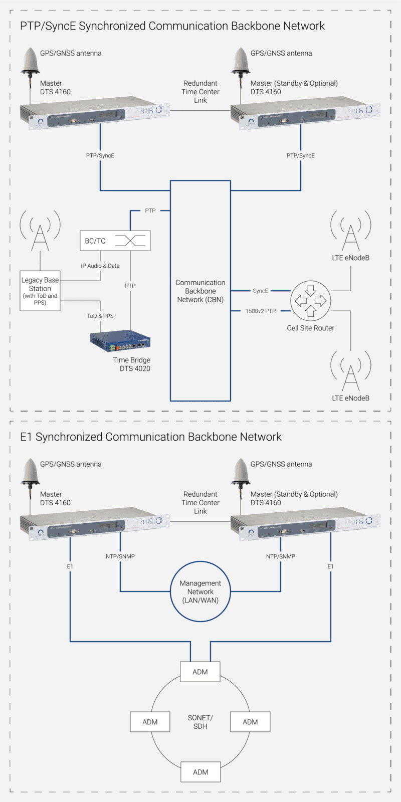 - En utilisant le Precision Time Protocol (PTP) et Synchronous Ethernet (SyncE), il fournit un temps de référence et un signal de synchronisation de phase pour d'autres horloges au sein des réseaux LTE /LTE-Advanced. UIT-T G.8272, profil télécom PTP UIT-T G.8265.1, G8275-1, G8275-2. gPTP : IEEE 802.1AS