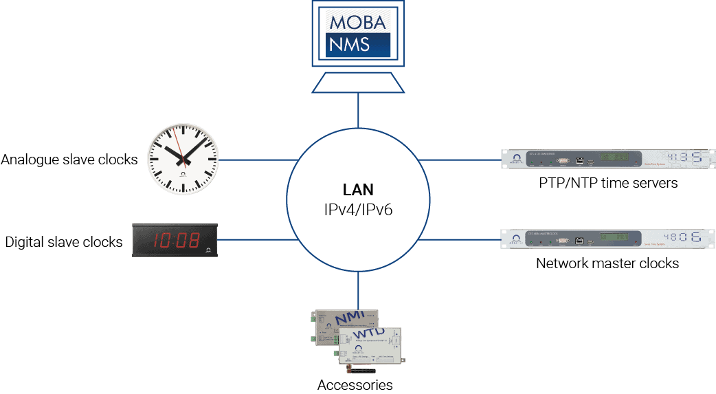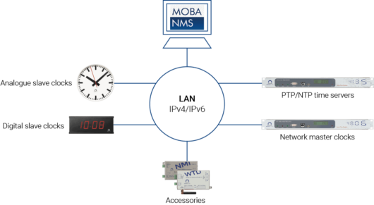 Configuration, monitoring and administration of your entire time system – including master and slave clocks. This is the must-have of managing time systems – and MOBATIME offers the solution: MOBA-NMS is a Network Management System. Manage all MOBATIME network devices in an entire Ethernet network on one platform.