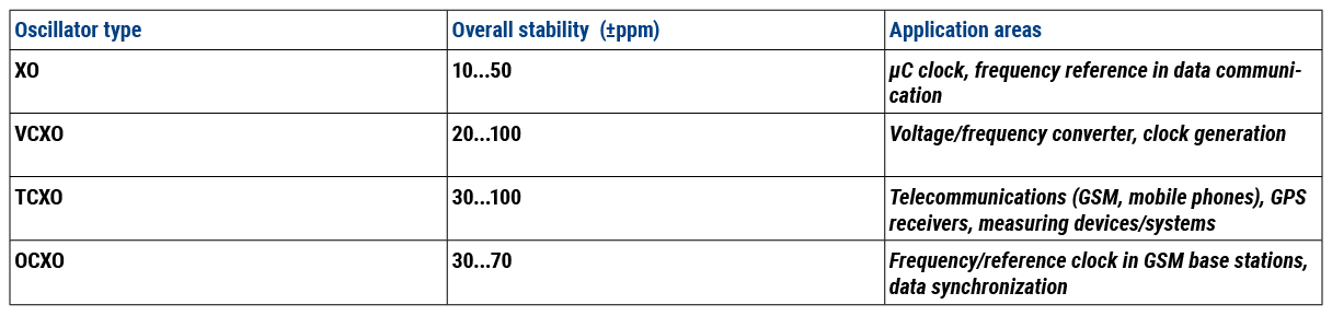 Oscillators are responsible for generating oscillations or clock signals, which form the basis for synchronization and timing in a variety of applications. Depending on the required precision and stability of the signal, different types of oscillators are used. The selection of an oscillator depends largely on its overall stability and the specific requirements of the application. A distinction is mainly made between simple crystal oscillators (XO), voltage-controlled crystal oscillators (VCXO), temperature-compensated crystal oscillators (TCXO) and oven-controlled crystal oscillators (OCXO), each of which is used in specific application areas such as data communication, telecommunications and precision measurement systems. The overview below provides an insight into the typical characteristics and application areas of different oscillator types to enable an informed selection for specific technical requirements.